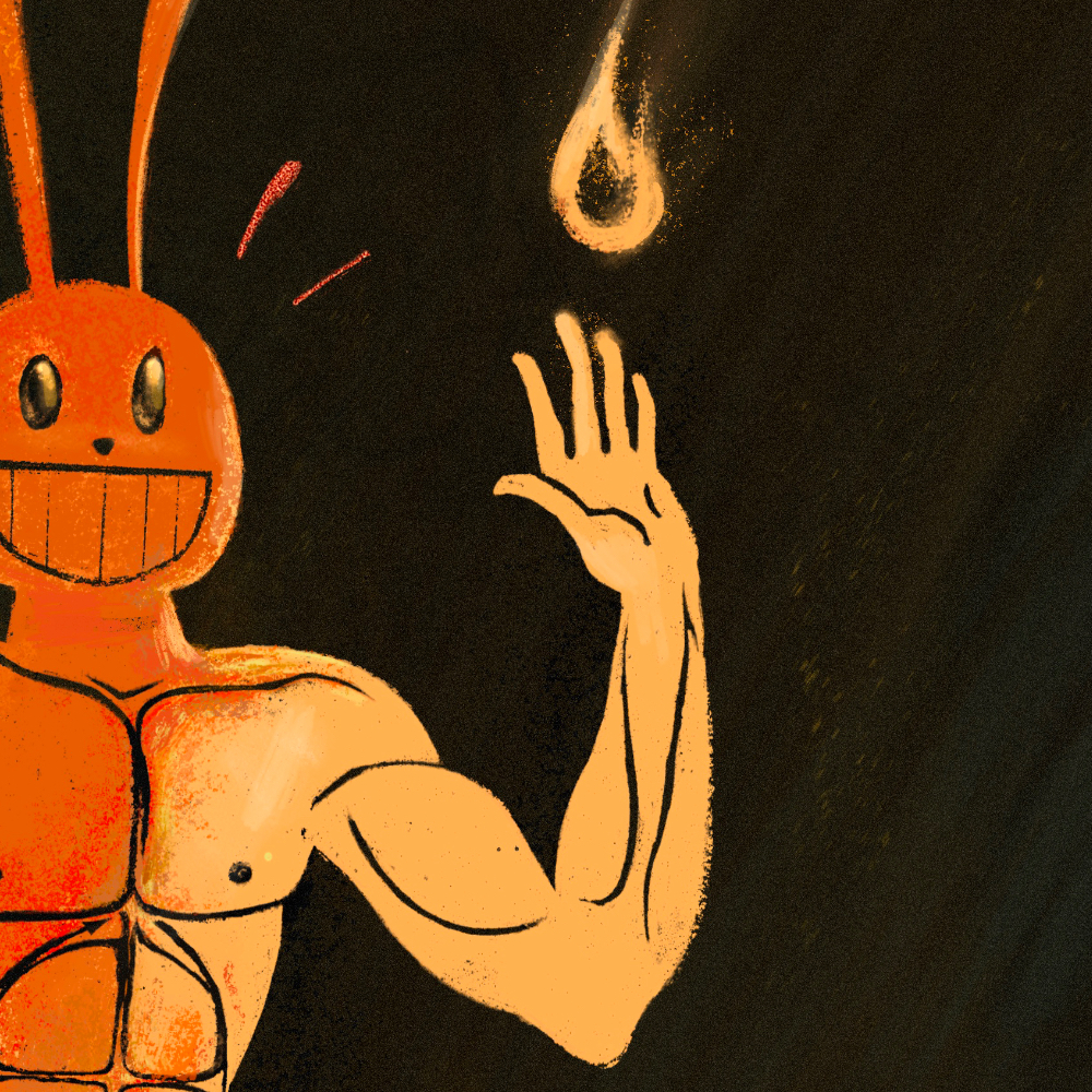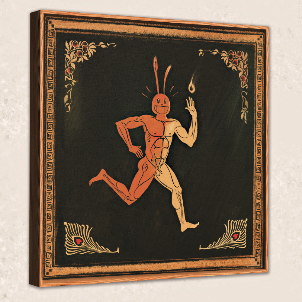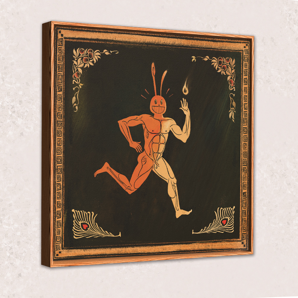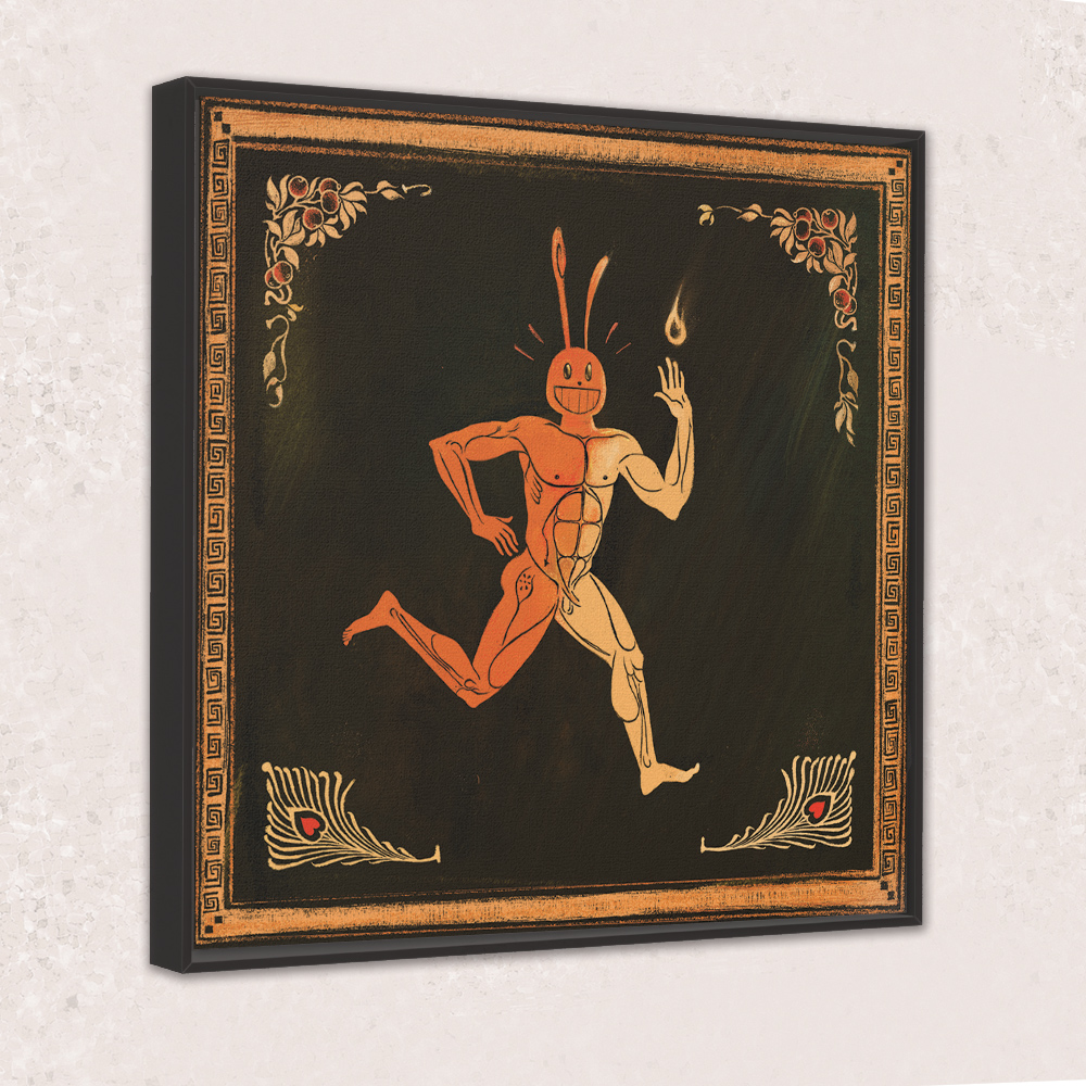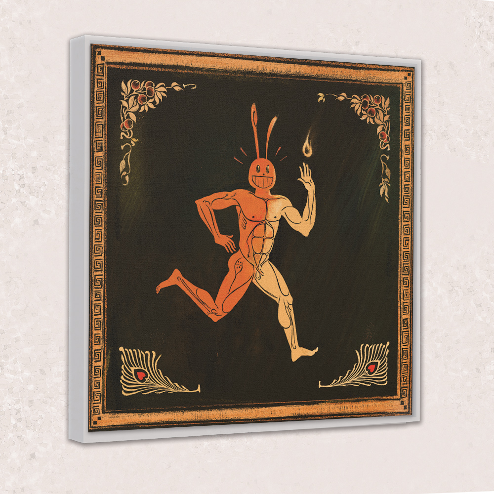 Choose between three colors of floating frames. "Reach For The Flame!" is an original painting by Cody Gene printed onto a premium stretched cotton canvas weave.